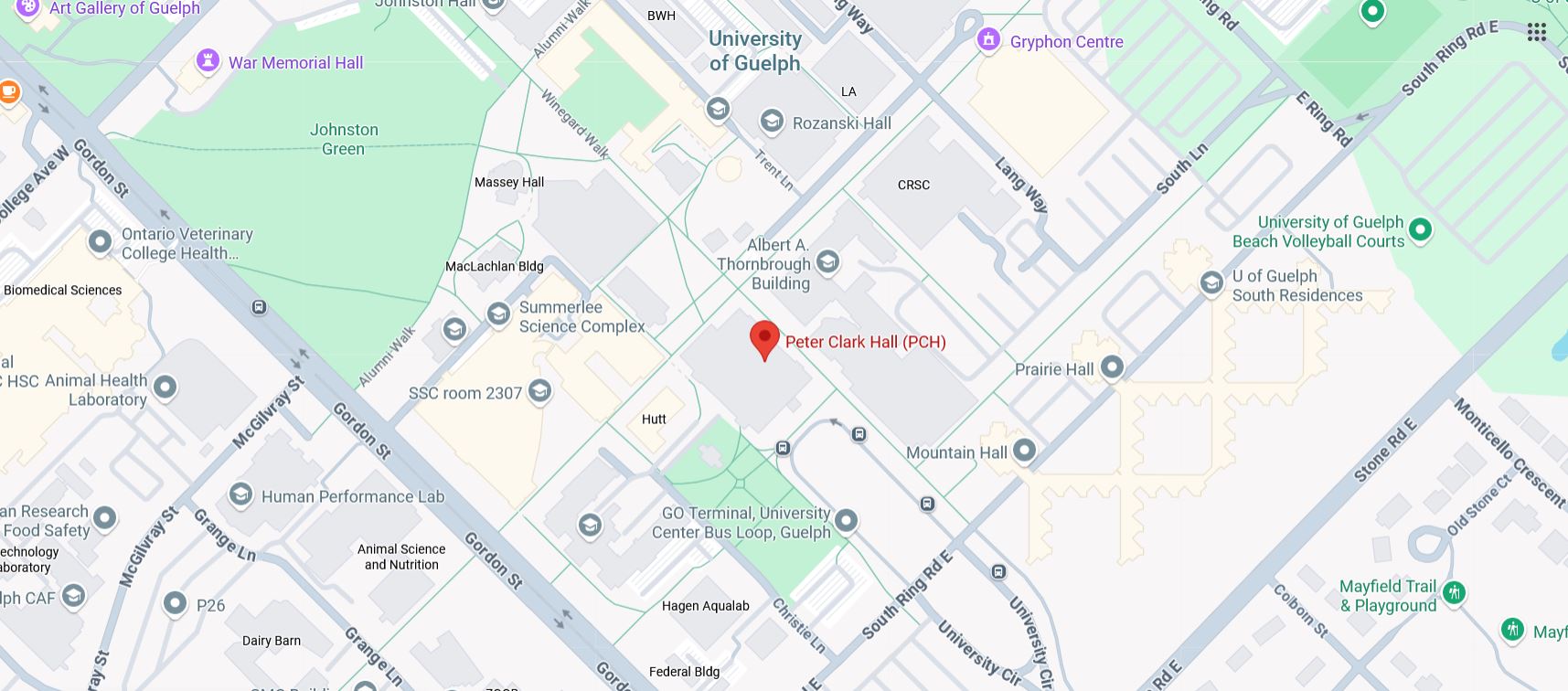 The mailing address for the University of Guelph is 50 Stone Road East, Guelph, Ontario, but to get to the closest parking lots for the University Centre, please enter "South Ring Road" into your GPS. This will take you to the road where parking lots P42 and P31 are located. Parking is free on weekends. Both parking lots combined should provide sufficient parking.