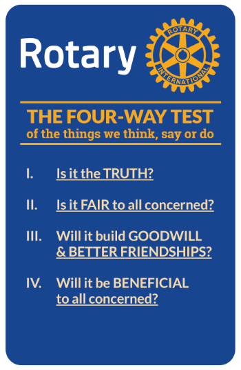 Rotary emphasizes integrity and high ethical standards. To uphold that The Rotarians are guided by the moral compass The Four-Way Test and the Rotary Code of Conduct.