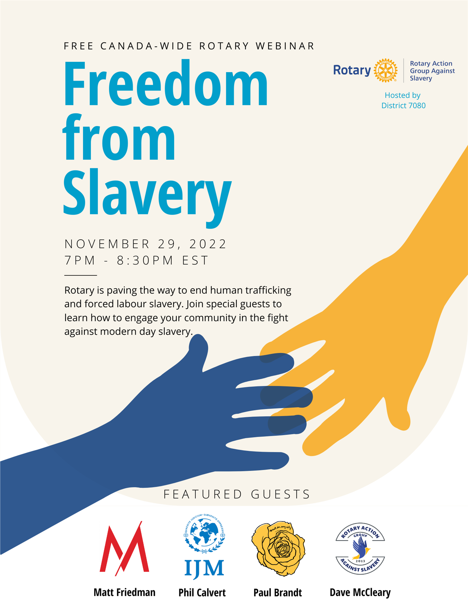 The District 7080 Human Trafficking Committee is part of The Rotary Action Group Against Slavery (RAGAS) who are dedicated to bringing awareness to the magnitude of forced labour slavery in Canada and abroad. By empowering and educating Rotarians and communities alike, we can take steps to eradicate human trafficking, together.